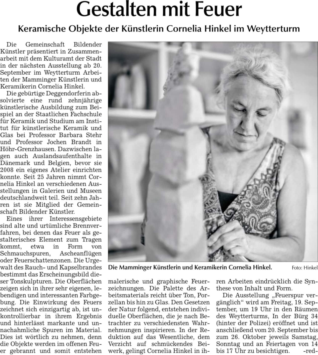 Die Gemeinschaft Bildender Künstler präsentiert in Zusammenarbeit mit dem Kulturamt der Stadt Straubing in der kommenden Ausstellung im Straubinger Weytterturm Arbeiten der Mamminger Künstlerin und Keramikerin Cornelia Hinkel.