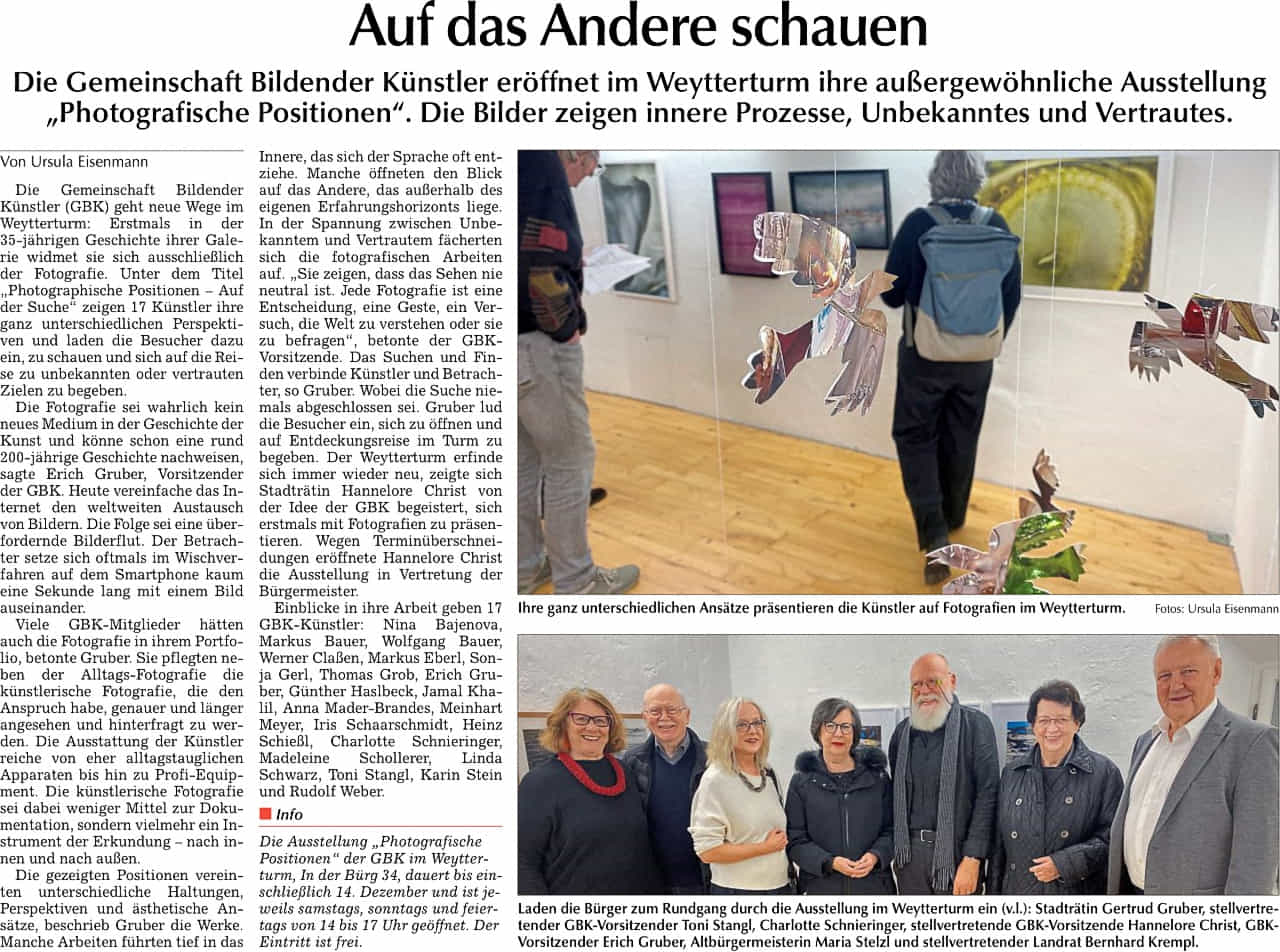 Die einzelnen Positionen gehen von der ureigenen Aussage aus und reihen sich in das Ouevre der jeweiligen Künstler/innen ein. Es gibt aber auch die andere Möglichkeit, dass sich in der Photographie eine eigene, anders sprechende Position herausschält und ein anderes Bild des Urhebers zeichnet. So bieten Wahrnehmung und Ausdruckskraft der einzelnen Fotokünstler/innen überraschende Sichtweisen und gewähren so einen interessanten Einblick in das photographische Oeuvre der GBK-Künstler: Nina Bajenova, Markus Bauer, Wolfgang Bauer, Werner Claßen, Markus Eberl, Sonja Gerl, Thomas Grob, Erich Gruber, Günther Haslbeck, Jamal Khalil, Anna Mader-Brandes, Meinhart Meyer, Iris Schaarschmidt, Heinz Schießl, Charlotte Schnieringer, Madeleine Schollerer, Linda Schwarz, Toni Stangl, Karin Stein, Rudolf Weber.